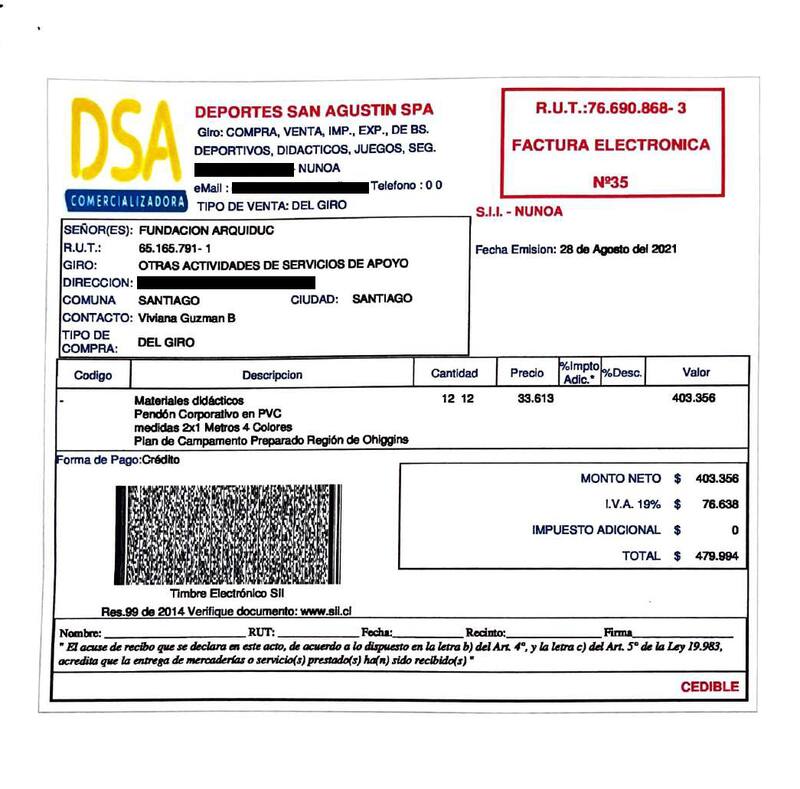 Se trata de facturas de las empresas “Deportes San Agustín SpA” y “Sociedad Abbott Acuña y Compañía Limitada” con las que Arquiduc justificó parte de los gastos realizados. Ambas firmas son propiedad de Carlos Acuña Arévalo, director ejecutivo de Arquiduc, quien se compró a sí mismo los materiales.