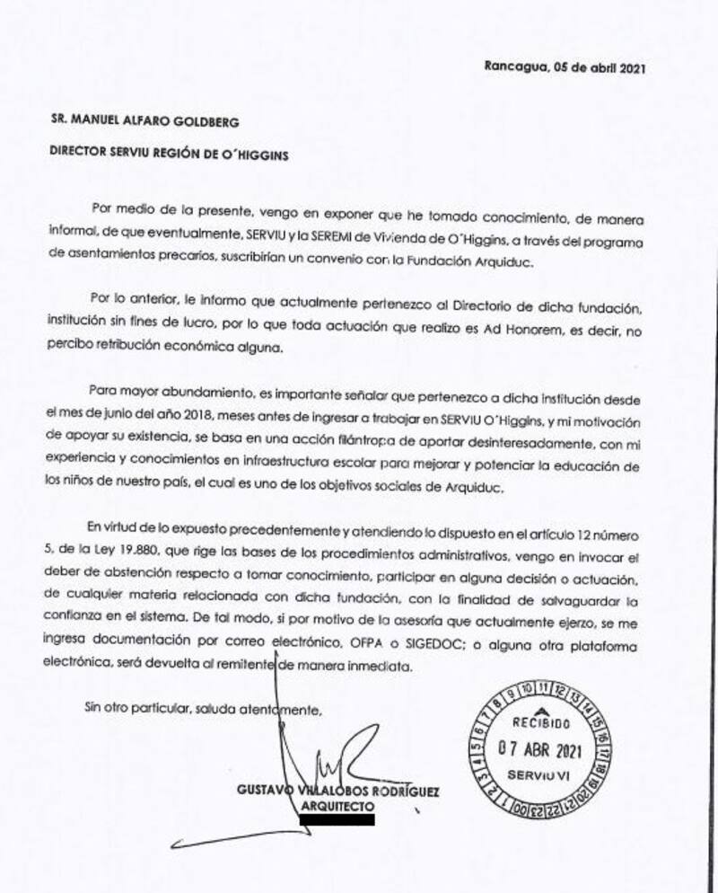 Por ello, el 7 de abril de 2021 Villalobos notificó por escrito a Alfaro que “he tomado conocimiento, de manera informal, de que eventualmente, el Serviu y la Seremi de Vivienda de O’Higgins, a través del programa de asentamientos precarios, suscribirán un convenio de colaboración con la Fundación Arquiduc”.