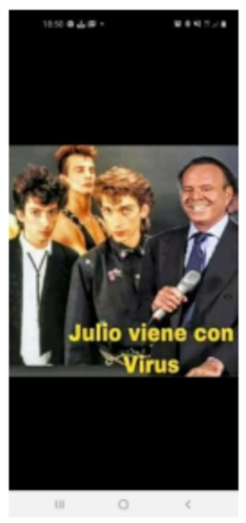 Entre las conversaciones de esa reunión, el juez Poblete le compartía memes al funcionario del Ejército, todos en junio del 2021. A raíz de esa fecha, estas gráficas correspondían a fotos del cantante Julio Iglesias, haciendo alusión al mes de julio que se aproximaba. “Julio viene con virus”, se puede leer en una de las fotos. “¡Ya viene Julio y no se ve muy bien”, dice otro de los memes enviados el 17 de junio de ese año. Imágenes que nunca fueron respondidas por parte de Grez.