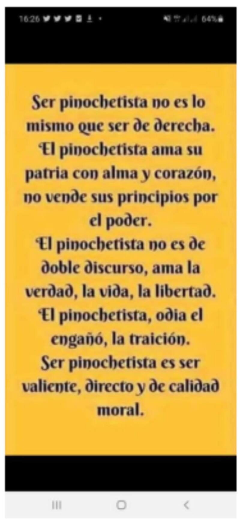 Ese mismo día Nazal le compartió a Poblete una imagen, en la que se puede leer una frase respecto a la dictadura. Más adelante de la conversación, el entonces juez de la Corte le envió una frase motivacional sobre la “dirección en la que hay que mirar en la vida”, así como también -nuevamente- otras fotografías de un ataque incendiario en la Región de La Araucanía. Mismo chat en el que Poblete le compartiría a Nazal una imagen con un escrito sobre el “significado de ser pinochetista”.