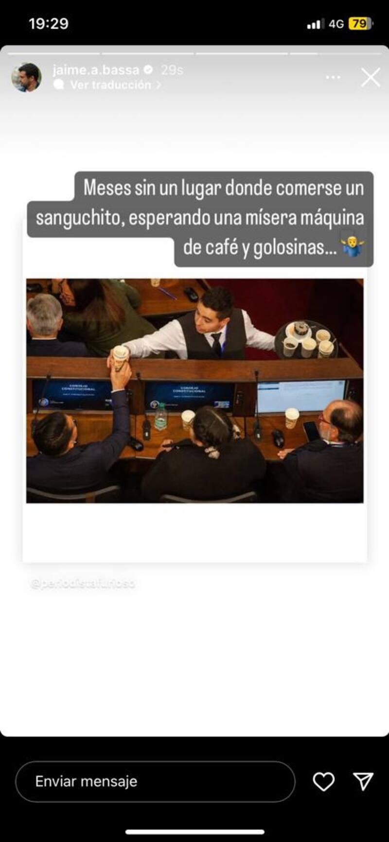 En concreto, el abogado cercano al Frente Amplio publicó una historia en su cuenta de Instagram en que compartía una foto de la jornada de instalación del Consejo. En ella, el abogado escribió: “Meses sin un lugar donde comerse un sanguchito, esperando una mísera máquina de café y golosinas”. Y acompañó el mensaje con un emoji levantando los brazos.
