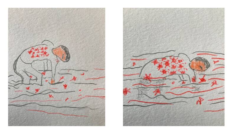 Saliendo de la UCI, hice a mi hijo Ismael unos bosquejos de lo que sentí que estaba viviendo. Los fotografié y se los mandé en un chat por el teléfono, con el objeto de que le sirvieran para un eventual guión de un corto animado (él venía saliendo de estudiar cine en la universidad). Lo hice con lo que tuve a mano.