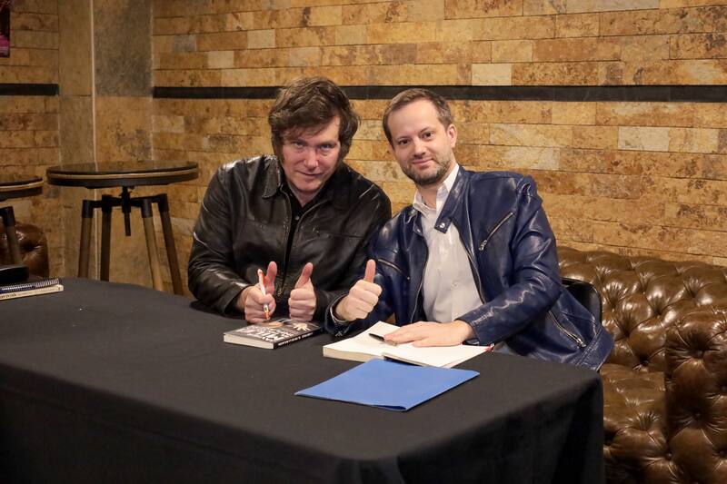 Tras las presentaciones, mientras Vamos por la gloria, canción de corte punk-rock de La Beriso sonaba, se escuchó un: “¡Viva la libertad, carajo!” desde arriba, en la entrada del teatro. Era Javier Milei que bajaba las escaleras y la gente se paraba a recibirlo y pedirle fotos, cual estrella del rock. Una vez abajo, nuevamente, tres veces su grito, y la respuesta de los asistentes llegaba con un “¡viva!” mientras mostraban, orgullosos, poleras con el rostro del candidato, banderas amarillas del libertarismo y los libros que esperaban fueran luego firmados.