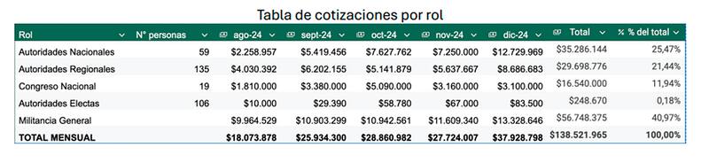 Por lo que, añade que “la meta de 40 millones de cotización mensual no solo es posible sino también conservadora frente a las capacidades potenciales de recaudación, que solo considerando a quienes ejercen un cargo producto de la capacidad política institucional del partido, posibilitarían un monto superior a los $50 millones mensuales”.