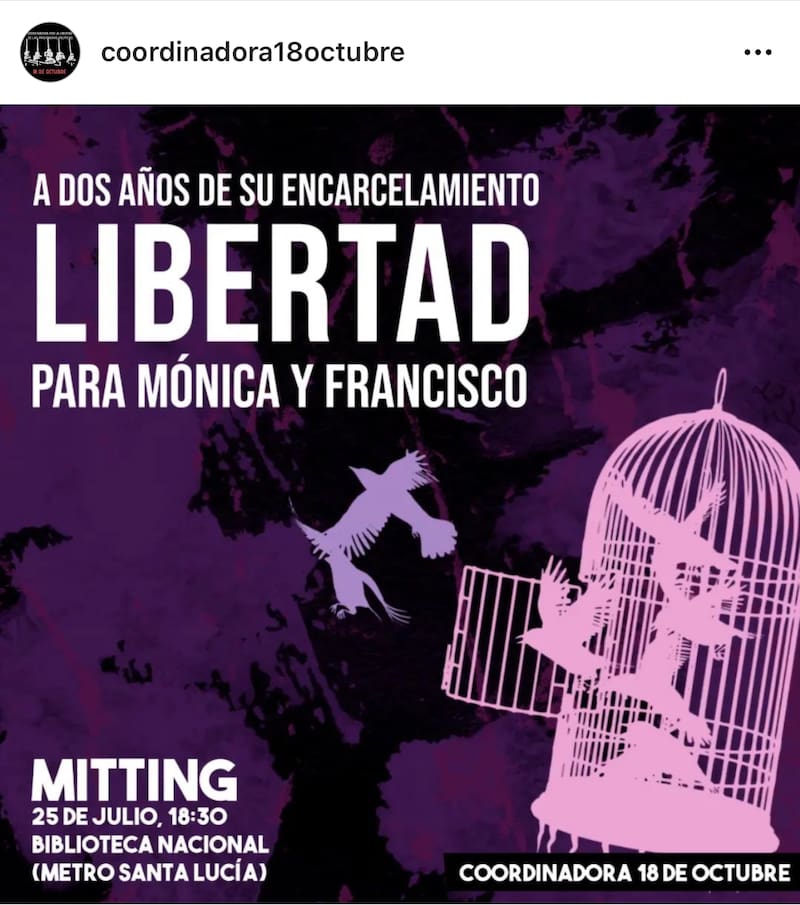 Ese anuncio, que está graficado con pájaros que salen de una jaula, finalizaba haciendo un llamado por la “libertad a todxs lxs presxs políticxs. Abajo los muros de las prisiones” (sic). Dicho grupo nació en el estallido social, desde entonces han convocado marchas vinculadas a las personas detenidas durante las manifestaciones en dicho contexto, los que han calificado como “presos políticos”.