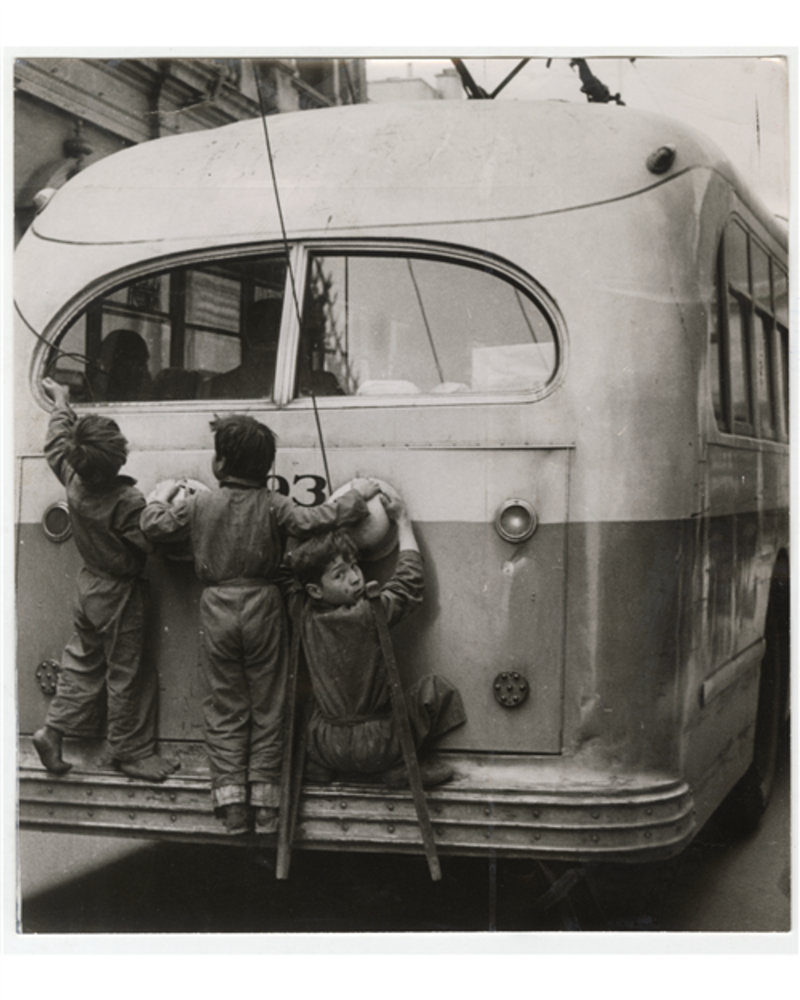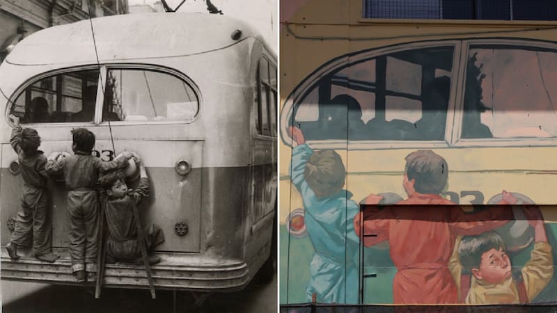 En lo que va del pintado, se alcanza a distinguir el dibujo de uno de los inmuebles del sector y su pileta. Y a la derecha, lo que a simple vista parece ser un trolebus -medio de transporte característico de Valparaíso y que también recorrió las calles de la capital- con tres niños colgando en su parte trasera, es una réplica de una fotografía tomada en 1954 en Santiago, según consta en la página del Museo Histórico Nacional.