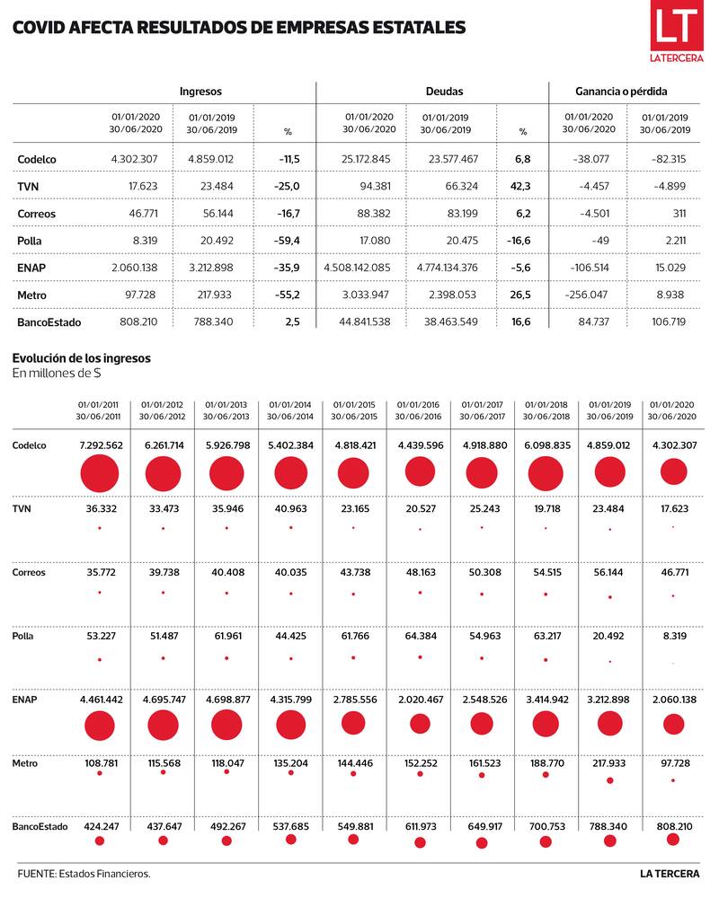 Al 30 de junio de 2020, Codelco, TVN, CorreosChile, Polla Chilena de Beneficencia, Empresa Nacional del Petróleo (Enap) y Metro de Santiago sumaron ventas por $7.341.095 millones. Mientras que en igual fecha del año pasado, sus ingresos fueron $9.178.303 millones. Es decir, las mismas empresas durante la pandemia generaron en ingresos por $1.837.208 millones menos. Sólo a modo de ejemplo, Codelco registró ingresos por US$5.238 millones durante junio de 2020 y no tenía ingresos tan bajos desde 2009, cuando obtuvo US$4.836 millones, considerando precios anualizados nominales y un tipo de cambio único de $821,23.