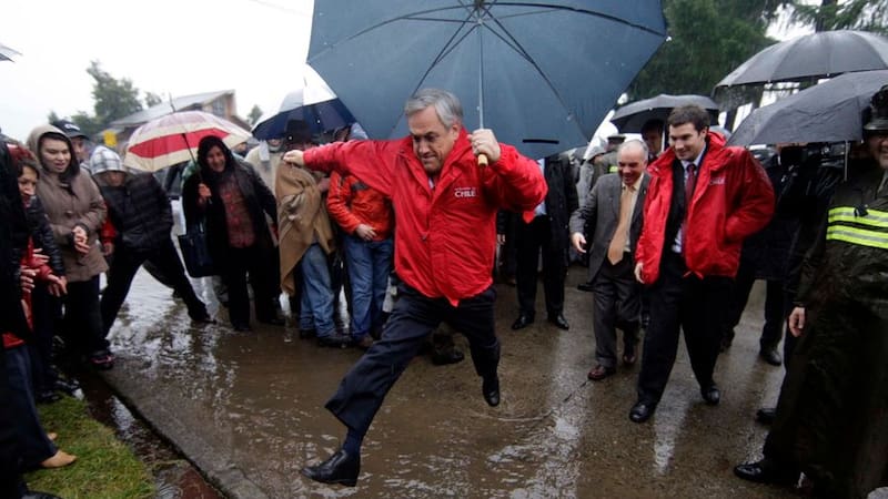 Una de las fotos más recordadas del exmandatario se produjo cuando estaba en una gira impulsada por la reconstrucción tras 27F. Piñera inspeccionaba el nuevo edificio municipal de la comuna de Melipeuco -en la Región de La Araucanía-, cuando fue capturado saltando una poza de agua. La imagen fue tomada entonces por Andrés Pérez, fotógrafo de La Tercera.