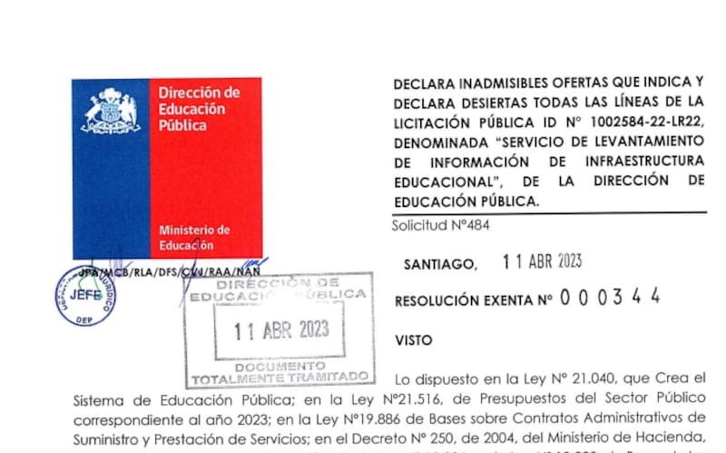 Aunque hasta febrero la DEP insistía (ya lo había hecho otras veces a lo largo del mismo proceso) en anunciar nuevos plazos de adjudicación -el 2 de ese mes señaló que la fecha límite sería el 6 de abril-, apenas cinco días después de ese supuesto vencimiento, mediante una resolución exenta firmada por Paulina Sáez, directora (s) de la DEP, el Mineduc declaraba desierto el proceso.