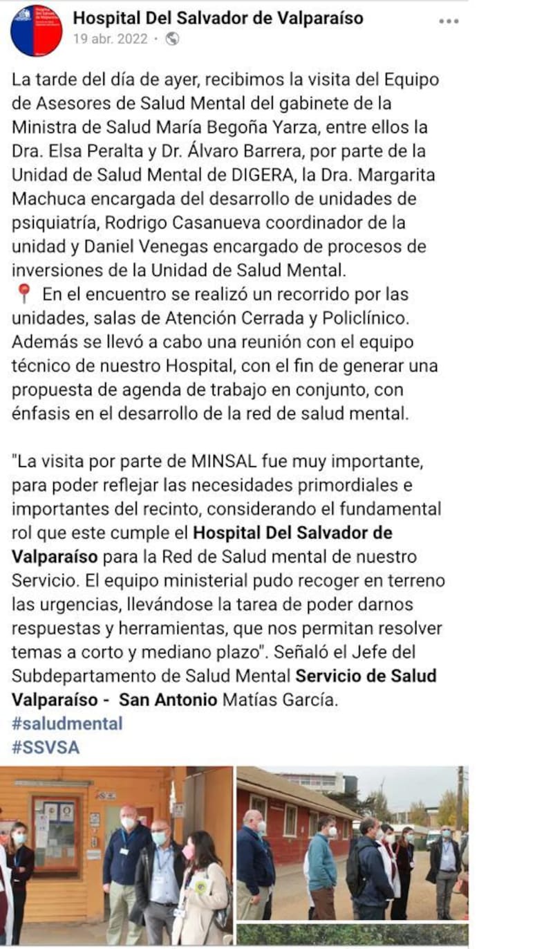 De hecho, en las propias redes sociales del recinto psiquiátrico detallaron en qué consistió la visita del Minsal. “La visita por parte de Minsal fue muy importante para poder reflejar las necesidades primordiales e importantes del recinto, considerando el fundamental rol que cumple el Hospital Del Salvador de Valparaíso para la Red de Salud mental de nuestro servicio”, señaló en abril el jefe del Subdepartamento de Salud Mental Servicio de Salud Valparaíso - San Antonio, Matías García. El equipo del Minsal acudió al establecimiento justamente para ver en terreno sus falencias y requerimientos, con la idea de mejorar la atención de los pacientes.