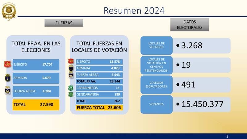 Desde el Estado Mayor Conjunto (EMCO) de las Fuerzas Armadas se detalló que los uniformados “están participando directamente con un total de 27.590 efectivos desplegados en todo el territorio nacional. De este total, 23.344 se encuentran resguardando el orden público al interior de los locales de votación, aumentando este número en un 6,9% respecto al año anterior, en línea al incremento de locales que estableció el Servel para este año. Este aumento fue de un 4,8% respecto a las elecciones de diciembre pasado, y es producto a la ley de georreferenciación que acerca los recintos de votación a la ciudadanía”.