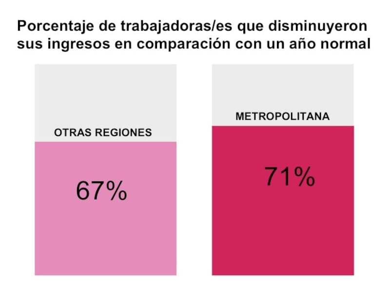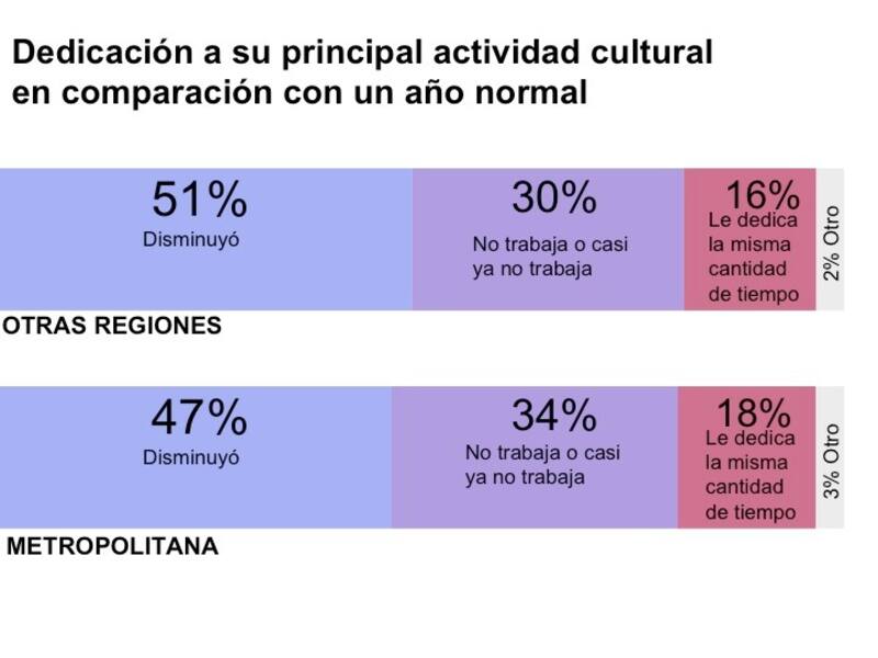 Lo primero que deja en claro el estudio, afirma, es el grado de paralización del sector: el 81% muestra una disminución o el cese absoluto de su actividad cultural. Asimismo, el 55% obtuvo en el último mes ingresos mensuales por $300 mil o menos. Se identifican, además, áreas en que el cese de actividades ha producido una baja dramática de ingresos. “En el caso del teatro, de la danza y de la música, por ejemplo, el rango de las personas que ganan en un año normal entre $ 500 mil y $650 mil mensuales tienen una baja del 77%, o sea, es un impacto altísimo. Me ha tocado ver algunas otras cifras de otros sectores y no son tan altas como éstas”, comenta Negrón.