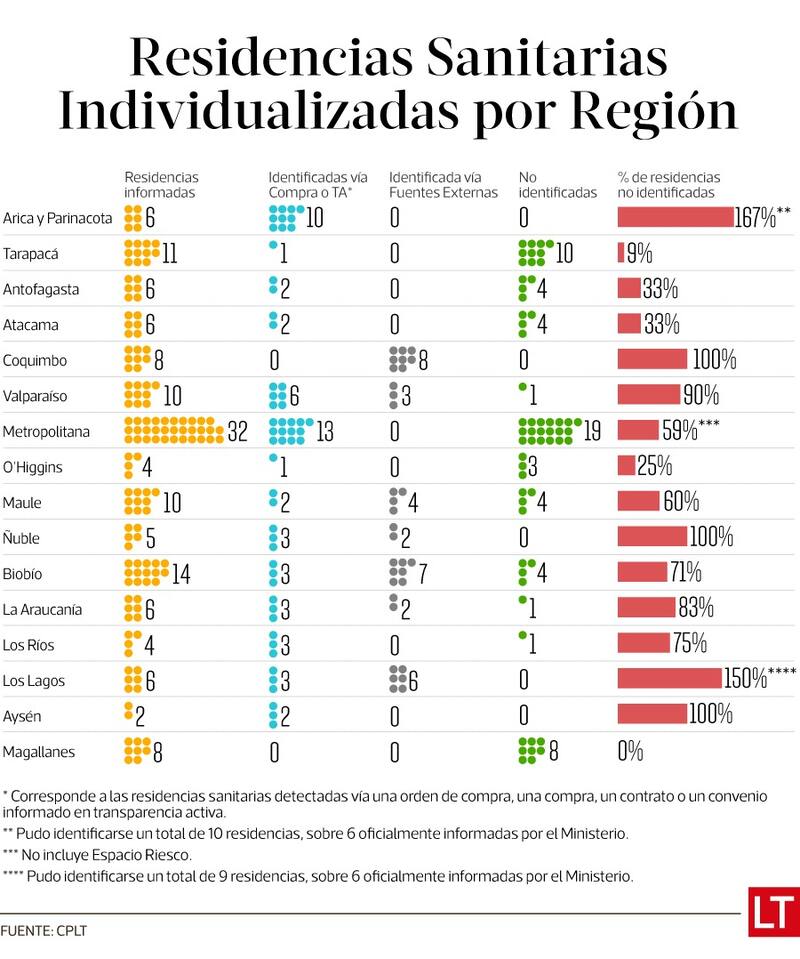Solo 86 de las 138 residencias sanitarias informadas oficialmente por el Ministerio de Salud al 23 de junio de 2020, pudieron ser individualizadas por el Consejo Para la Transparencia (CPLT), a través de registros públicos que deben estar disponibles vía ley de Transparencia.
