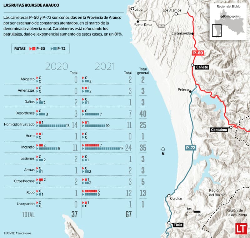 La Ruta P-60 une Cañete, Contulmo y también el Biobío con La Araucanía. En ese trayecto, este año, se han registrado 17 eventos delictuales asociados a violencia rural, donde predominan los ataques incendiarios y robos. Por su parte, en la Carretera P-72, la que atraviesa las comunas de Cañete, Quidico y Tirúa, en tres meses han ocurrido 50 ilícitos de esta naturaleza, en su mayoría incendios y homicidios frustrados (ataques armados a autos y policías).