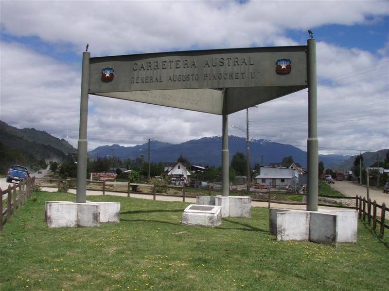 Así versa la placa que, desde el año 2000, acompaña al monumento que rinde homenaje a Augusto Pinochet en La Junta, localidad ubicada en plena carretera austral, en la comuna de Cisnes, región de Aysén.