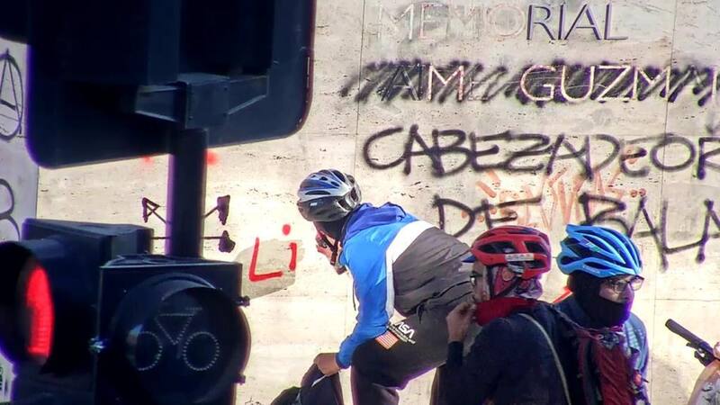 Según la misma información, luego llegaron al frontis de la sede de RN, donde también rayaron muros y rompieron tres ventanales. A raíz de la situación, el guardia de seguridad escapó del lugar. Después, los ciclistas llegaron cerca de las 9.20 al memorial Jaime Guzmán, en Las Condes. Ahí, un grupo de estos se desprendió nuevamente del resto y empezó a rayar el memorial con spray con consignas sociales.