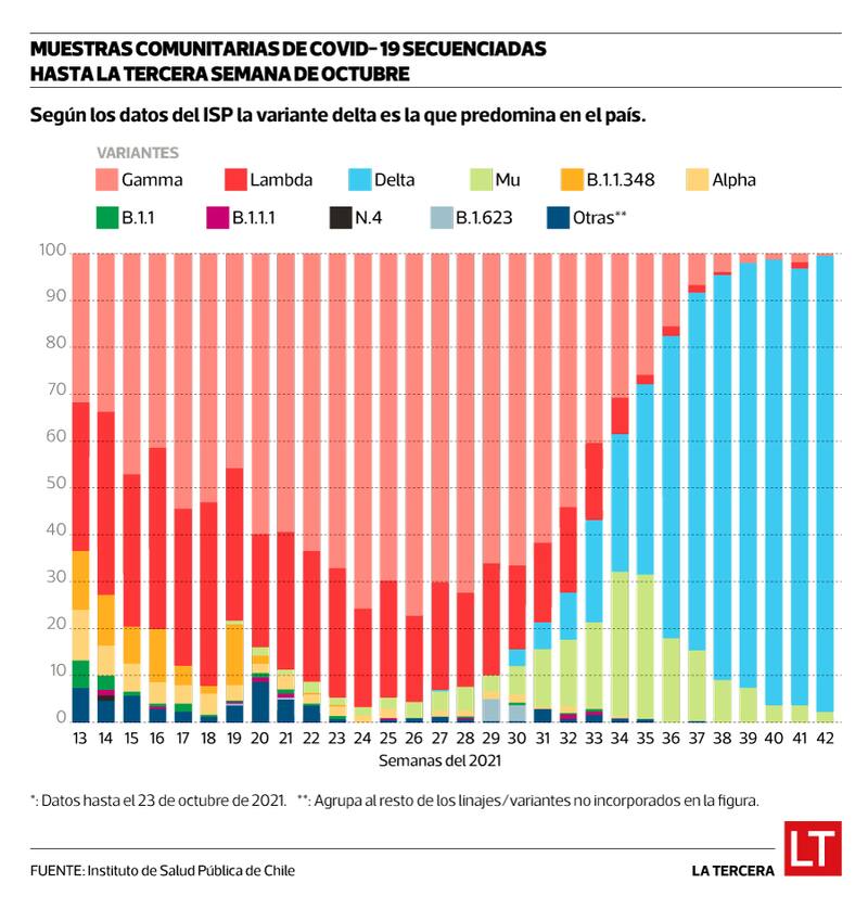 Y en 20 semanas, delta ha hecho lo propio en el país. La variante tiene casi total dominio en la circulación de coronavirus y fue detectada en el 97,4% de las muestras que procesó el Instituto de Salud Pública hasta los últimos días de octubre.