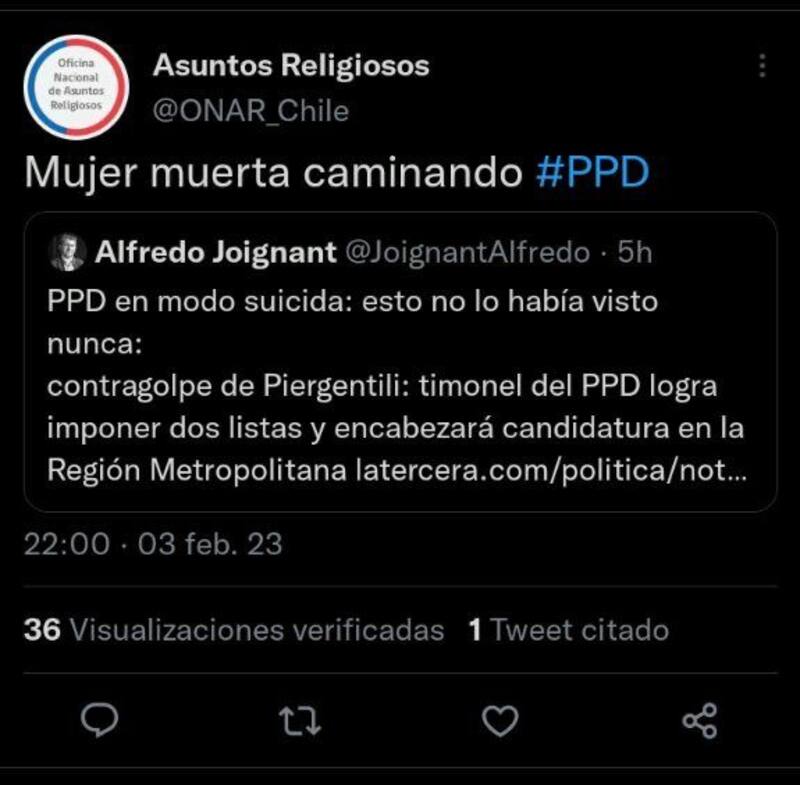 Además, Warnken adelantó que ha habido solidaridad con Piergentili a raíz de los ataques que ha sufrido en los últimos días. Uno de los episodios que lamentaron fue la publicación de un tuit en la cuenta oficial de la Oficina Nacional de Asuntos Religiosos, dependiente de la Segpres, en que se referían a la timonel como “mujer muerta caminando”, en medio de la ratificación por parte de su partido de competir en una segunda lista electoral, distanciada de Apruebo Dignidad. En esta línea, desde la directiva de Amarillos adelantan que publicarán un comunicado que abarque sus próximas definiciones.