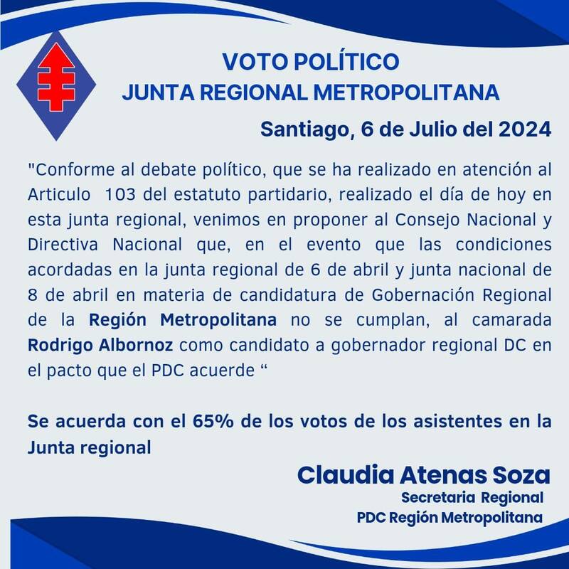 En los últimos días las críticas de la DC al gobernador se han intensificado. Tanto así, que el sábado en la mañana se realizó una sesión de la junta regional metropolitana del partido que tenía por objetivo “debatir sobre nuestra candidatura a la Gobernación Regional”. Finalmente, la instancia emitió un voto político en que se acordó, con el respaldo del 65% de los asistentes, proponer a la directiva DC, que encabeza Undurraga, respaldar la candidatura del abogado Rodrigo Albornoz como “plan B”. Durante la tarde de ese día se le compartió la resolución de la instancia al timonel.
