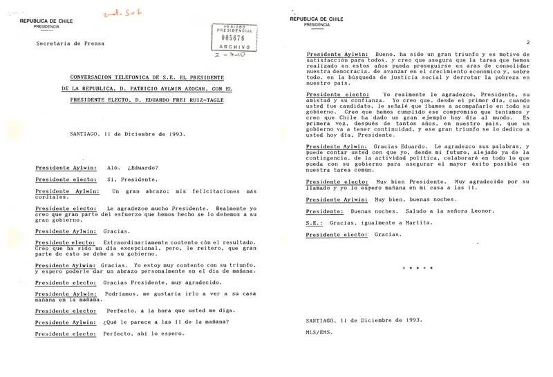 El Presidente Aylwin, en tanto, llamó por teléfono desde La Moneda al Mandatario recién electo, forjando el inicio de una tradición. “Un gran abrazo, mis felicitaciones más cordiales”, le expresó. “Le agradezco mucho Presidente. Realmente yo creo que gran parte del esfuerzo que hemos hecho se lo debemos a su gran gobierno”, respondió Frei.