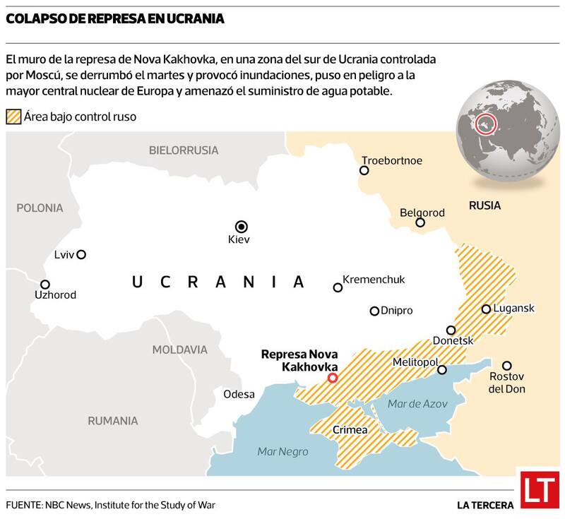 El muro de una importante represa en una zona del sur de Ucrania controlada por Moscú, se derrumbó el martes y provocó inundaciones, poniendo en peligro a la mayor central nuclear de Europa y amenazó el suministro de agua potable. Mientras, funcionarios de ambos bandos se apresuraban a evacuar a los residentes y se culpaban mutuamente del incidente.