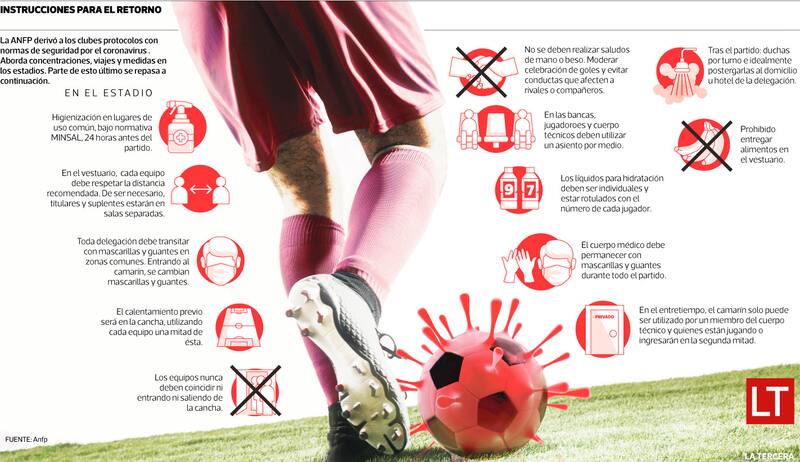 La ANFP prepara el retorno. Desde Quilín envían a los 33 clubes del fútbol profesional la propuesta de protocolos de seguridad para el inicio de la actividad, programado por los clubes para el 31 de julio. Esa fecha, que algunos médicos lo miran con pesimismo, solo podría alterarse en caso de que el Minsal se oponga.