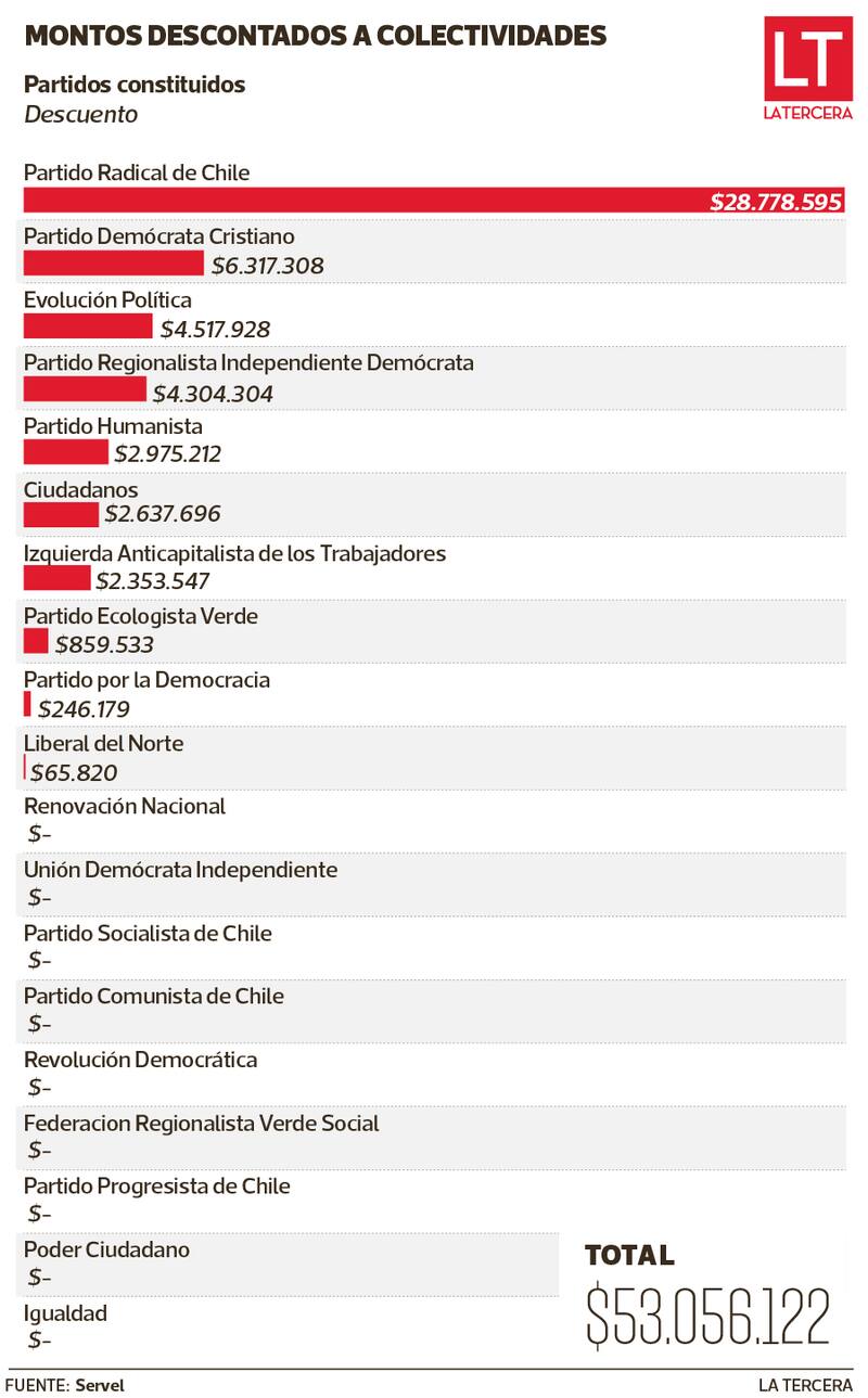El Partido Radical es la colectividad que sufrió el mayor descuento: 28 millones de pesos. Le siguen la DC y Evópoli con descuentos de 6 y 4.5 millones, respectivamente. El Servicio Electoral efectúa estos recortes a las colectividades cuando incumplen la norma legal que obliga a destinar un 10% de su presupuesto en actividades que fomenten la participación política de las mujeres o cuando hay gastos mal rendidos.