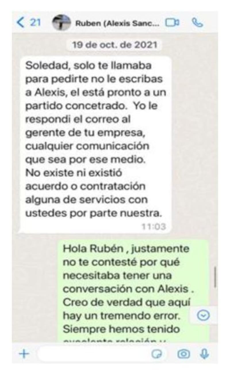 Cuatro días después, Inostroza es más enfático. “Soledad, solo te llamaba para pedirte que no le escribas a Alexis. Él está pronto a un partido, concentrado. Yo le respondí el correo al gerente de tu empresa- Cualquier comunicación, que sea por ese medio”, plantea. En el siguiente punto seguido, lanza el bombazo: “No existe ni existió acuerdo o contratación alguna de servicios con ustedes por parte nuestra”, establece.