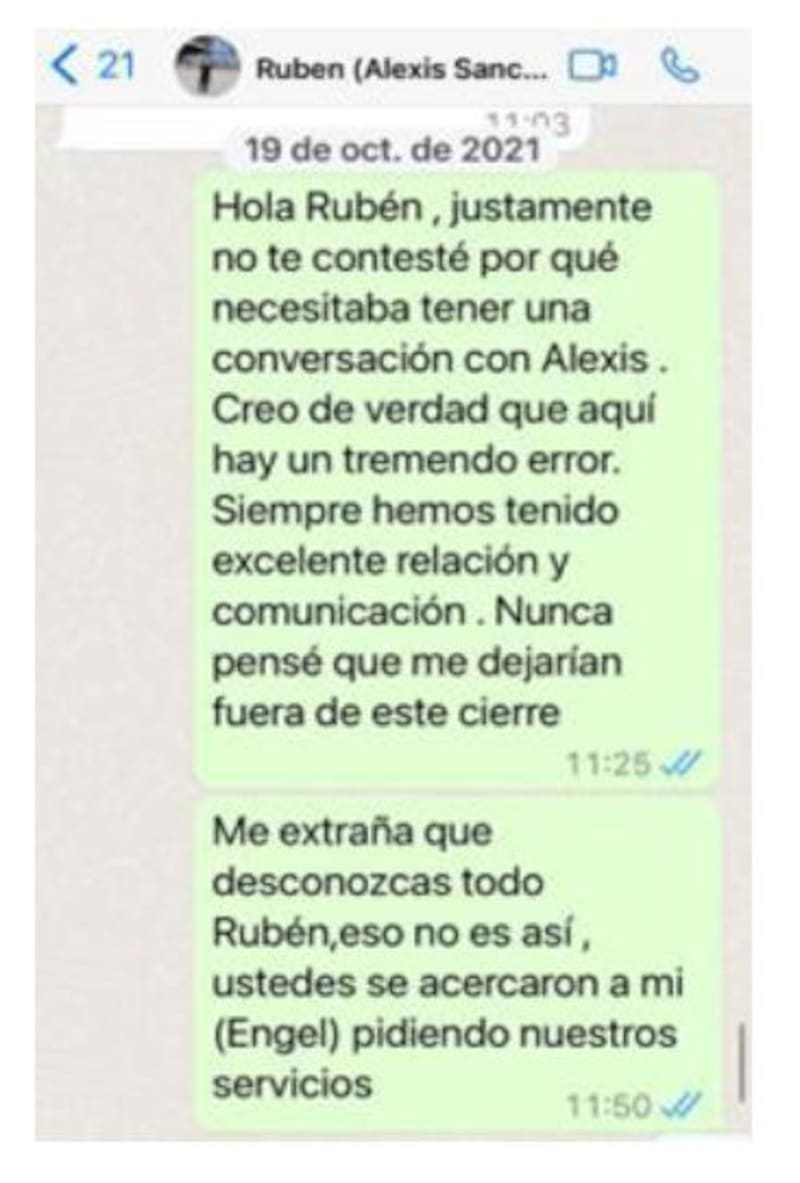 Cheyre reacciona 22 minutos después. “Hola, Rubén. Justamente no te contesté porque necesitaba tener una conversación con Alexis. Creo de verdad que aquí hay un tremendo error. Siempre hemos tenido excelente relación y comunicación. Nunca pensé que me dejarían fuera de este cierre”, plantea.