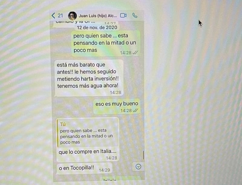 También aparecen mensajes de Juan Luis Alcalde en el marco de la negociación. El integrante de la familia dueña del sitio ironiza respecto de la posibilidad de bajar el precio del fundo, con un tono de molestia. “Que lo compre en Italia... o en Tocopilla!!!”, plantea frente a una observación relativa a que Sánchez pretendería bajar el precio a “la mitad o un poco más”.