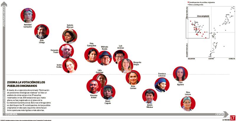 Lo primero que entrega el ejercicio, cuando se integran al cuadro las votaciones de los 155 convencionales, es que los pueblos originarios se posicionan a la izquierda de la Convención. Sin embargo, entre ellos hay evidentes diferencias. Por ejemplo, la presidenta Loncon figura como la convencional más cercana al centro y también como quien tiene la postura más flexible. En el otro extremo se ubica Llanquileo, que es la convencional más a la izquierda. Entre ellas, en tanto, aparece Godoy.
