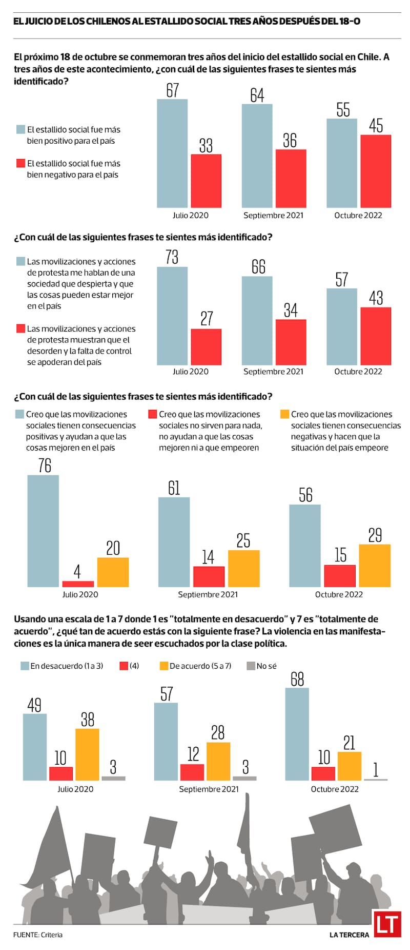 Por ejemplo, si en julio de 2020 el 67% de los participantes pensaba que el estallido social “fue más bien positivo para el país”, a octubre de 2022 ese porcentaje cayó a 55%. En la contraparte, si en julio de 2020 el 33% de los encuestados creía que el 18-O “fue más bien negativo para el país”, esa cifra ahora llega a 45% (ver infografía al final de la nota).