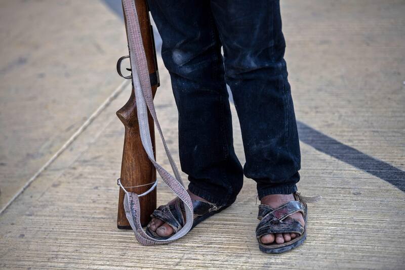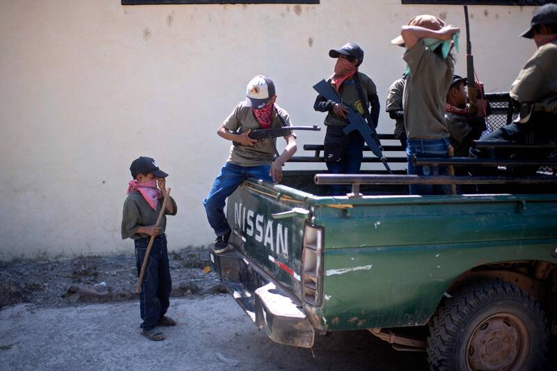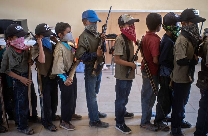 Detrás de los niños caminan los adultos de la autodefensa con rifles y pistolas, en una escena ya mostrada un año atrás para llamar la atención del Presidente izquierdista Andrés Manuel López Obrador.