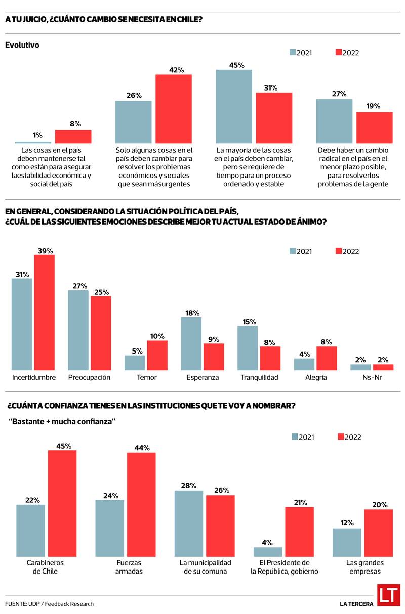Según esta encuesta -llevada a cabo cara a cara en hogares de 49 comunas de la Región Metropolitana, Valparaíso y Biobío, entre el 5 de octubre y 4 de noviembre-, el 42% apunta a que “solo algunas cosas en el país deben cambiar para resolver los problemas económicos y sociales que sean más urgentes”. En el estudio de 2021, solo el 26% pensaba de esa manera. A su vez, el 31% de los encuestados dijo que “la mayoría de las cosas deben cambiar, pero se requiere de un tiempo para un proceso ordenado y estable”. El año pasado, ese porcentaje se situó en 45%. En cuanto al apoyo a “un cambio radical en el país en el menor plazo posible, para resolver los problemas de la gente”, este bajó de 27% a 19%.