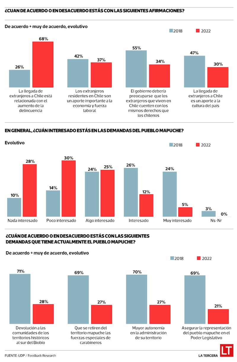 De acuerdo con la versión 2022 de la Encuesta Jóvenes, Participación y Medios, que anualmente realiza el centro Ciclos de la UDP en conjunto con Feedback Research, la mayoría de las personas entre 18 y 29 años tiende ahora hacia la moderación y apuesta por cambios graduales. Este giro salta a la vista en el hecho de que el 28% dijo estar “nada interesado” y un 30% “poco interesado” en las demandas del pueblo mapuche. Además, el 68% responsabiliza a la población extranjera por el aumento de la delincuencia, 42 puntos más respecto de 2018.