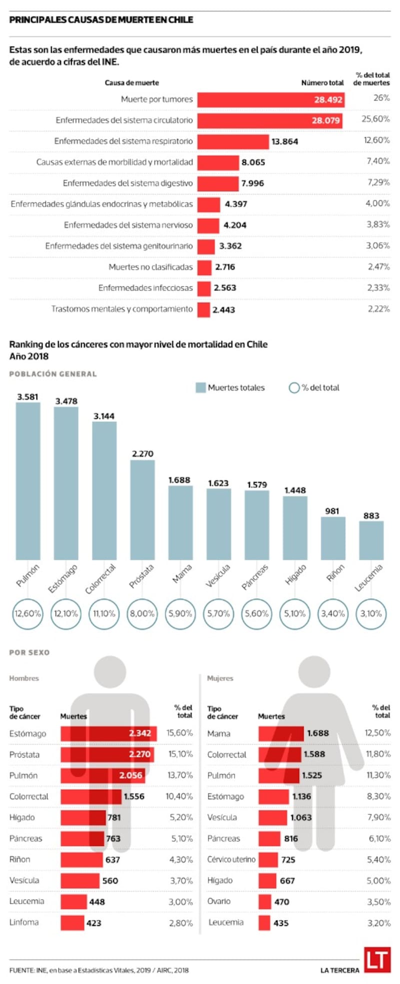 Por primera vez desde que hay registros en el país, los tumores ocupan el primer lugar en causas de muerte desplazando a las enfermedades del sistema circulatorio, que estuvieron en ese sitial durante los últimos años, según Estadísticas Vitales 2019 del INE. Los especialistas explican que en Chile ahora se vive más tiempo, lo que genera más oportunidad de desarrollar una enfermedad asociada al envejecer, como el cáncer