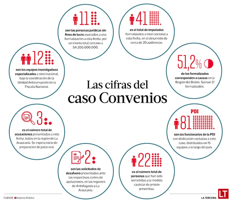 Se contabilizan, además, un total de 41 imputados formalizados en 20 audiencias, 21 de ellos correspondientes a indagaciones que se siguen en la Región del Biobío. O sea, más del 50% corresponde a personas vinculadas a convenios que se firmaron en esa zona del país.