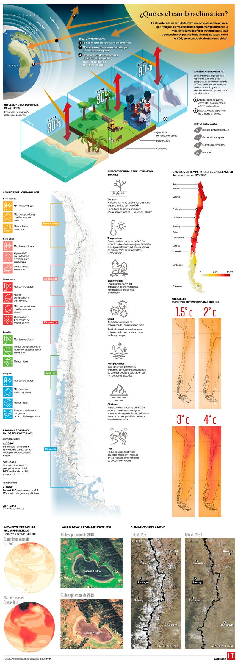 El avance del desierto hacia el sur; clima semidesértico en Santiago; la eventual desaparición de la laguna de Aculeo y Peñuelas y termómetros superando los 40 °C: así podría ser el clima en Chile si la temperatura sube más de 1,5 °C, como el lapidario informe de la ONU de este lunes recordó que probablemente ocurra.