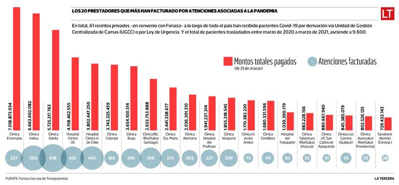 Sobre los montos asociados, hasta el 31 de marzo -y solo por internaciones asociadas al Covid-19- el seguro público ya ha desembolsado a las clínicas privadas $62.553 millones asociados a 5.257 facturas de atenciones de sus afiliados.