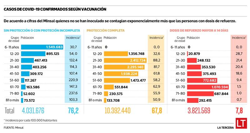 En la tasa de mortalidad la inoculación de refuerzo también tiene resultados positivos. Según las cifras del Minsal la incidencia es cero, mientras que con dos dosis sube 0,2 y en el caso de los no vacunados aumenta a 0,5.