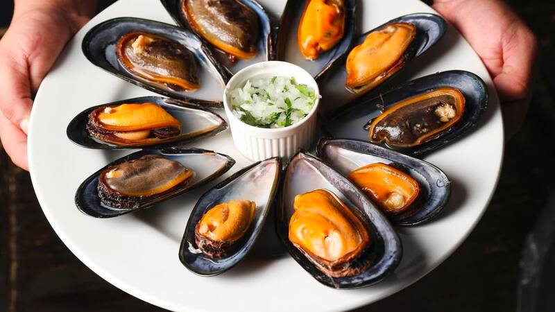 Así las cosas, nos pudimos ubicar en uno de los comedores del segundo piso y para partir pedimos una porción de ostras ($8.900) más una copa de espumante ($3.900) y un schop Mestra ($4.900). Los bebestibles llegaron a la mesa junto a una panera con unos pequeños panes amasados calentitos, de vicio, y mantequilla. Después vinieron las ostras (12) todas bien pequeñas, gorditas y muy sabrosas. Venían servidas sobre un plato con hielo picado y acompañadas por una salsa verde. Sin embargo, solo con limón quedaron mucho mejor.