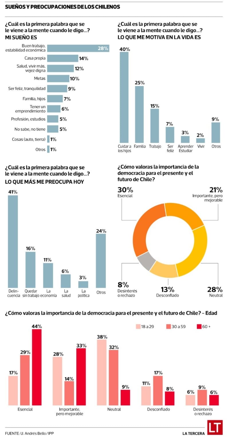 Una encuesta de la Universidad Andrés Bello indagó en los sueños y preocupaciones de la población. Las respuestas revelan que ni la casa propia ni los estudios motivan a la mayoría. Al mismo tiempo, apenas un 30% valoró la democracia como algo “esencial”.