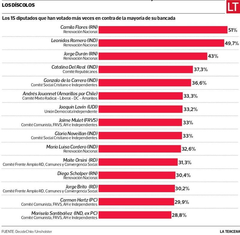 En el caso de Romero -independiente, pero perteneciente a la bancada de RN- el porcentaje ascendió a un 49,73% y Durán se posicionó en el tercer lugar con un 43,04%. A la lista se suman también los diputados Catalina del Real (Ind-Republicanos), con un 37,32% de desalineamiento de su bancada; Gonzalo de la Carrera (Ind-Comité Social Cristiano e Independientes), con un 36,56% de “votos díscolos”; Andrés Jouannet (Amarillos por Chile), con un 33,33%; Joaquín Lavín (UDI), con 33,22%; Jaime Mulet (FRVS) con 33%; Gloria Naveillán (Ind-Comité Social Cristiano e Independientes) con 33%; y María Luisa Cordero (Ind-RN). 32,57%.