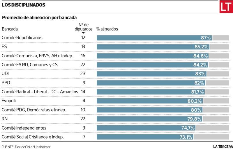 Otro dato: tres cuartos del total de bancadas de la Cámara Baja tuvieron un promedio de alineación superior al 80%. Sólo tres no alcanzaron esta barrera: Renovación Nacional (79,8% que votaron en línea con sus pares); el comité de Independientes (74,7%) y, en el último lugar, el comité Social Cristiano que obtuvo un 73,1%.