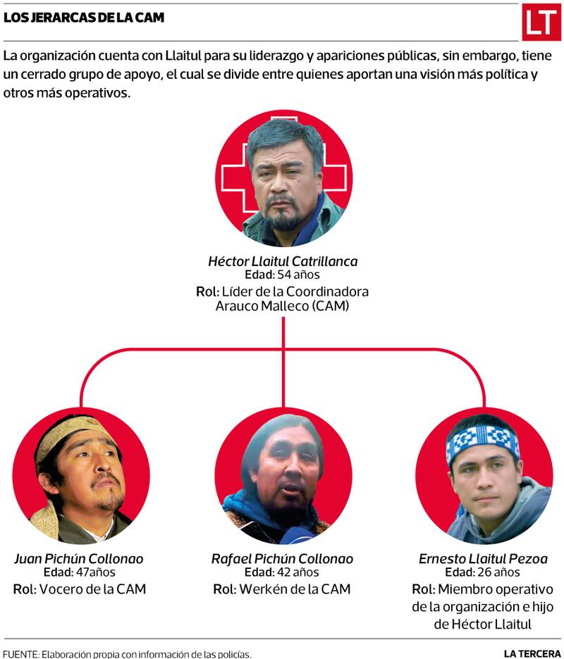 Aunque públicamente se muestra solo, como cuando asiste a charlas, seminarios u otras actividades de este tipo, Llaitul cuenta con un círculo cerrado de hombres de confianza (ver infografía). Ahí -de acuerdo a distintos reportes que manejan las policías- aparecen los hermanos Juan Pichún Collonao (47), Rafael Pichún Collonao (42) y el ya mencionado Ernesto Llaitul Pezoa. De ahí “para abajo” se trata de integrantes de las siete Organizaciones de Resistencia Territorial (ORT), el denominado “brazo armado” de la CAM.