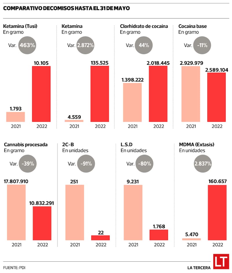 En cifras de la PDI, si entre enero y mayo del 2022 se incautaron 10.105 gramos de ketamina transformada en Tusi, el año pasado a la misma fecha la cifra llegó a los 1.793 g, lo que refleja un aumento de más de 463%. En todo 2021, en tanto, se requisaron 4.497 g de esta droga. Respecto a la sustancia pura, la que muchas veces se termina mezclando con otras drogas, como cocaína, en el mismo periodo del año pasado se decomisaron 4.559 g, mientras que este año ya van 135.525 g, un 2.872% más.