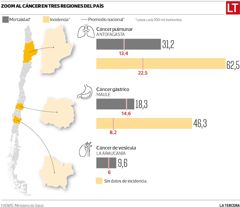 Los expertos han podido identificar otro cáncer que tiene una alta presencia en una zona específica: los tumores gástricos en el Maule. De acuerdo con los datos de la cartera sanitaria, la Séptima Región tiene la incidencia de cáncer gástrico más alta en el país, pues en la zona se registran 46,3 casos cada 100 mil habitantes, casi seis veces más que el promedio nacional, de 8,2.