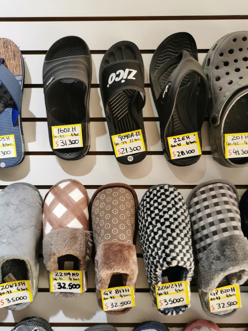 Allí, en el número 88 de Bascuñán Guerrero y frente a un gigante dragón chino que parece querer escapar de la fachada de un centro comercial, se ubica Comercial Tolina, una pequeña tienda que vende al por mayor productos de calzado. En su interior, en un muro blanco, cuelgan ordenadas una al lado de otra decenas de chalas, sandalias y pantuflas, de varias formas y colores, que se venden por docena.