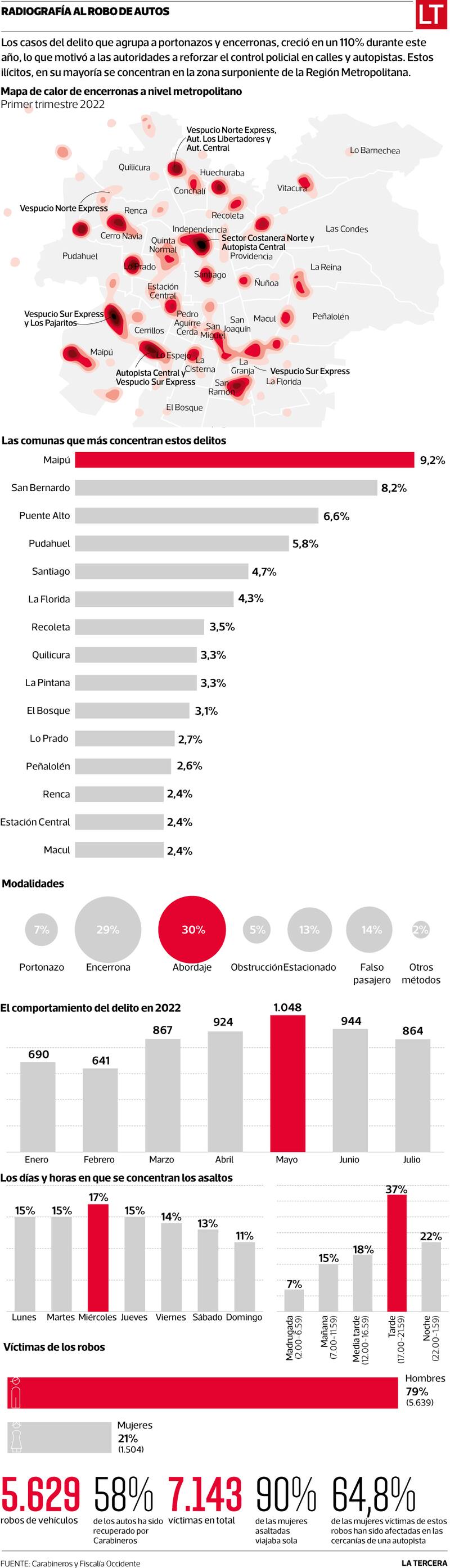 Es que este año en particular el robo violento de vehículos se transformó en un problema para las autoridades, registrándose 5.629 de estos casos (ver infografía), donde las “encerronas”, “portonazos” y “abordazos” concentran el 66% del total de estos ilícitos.