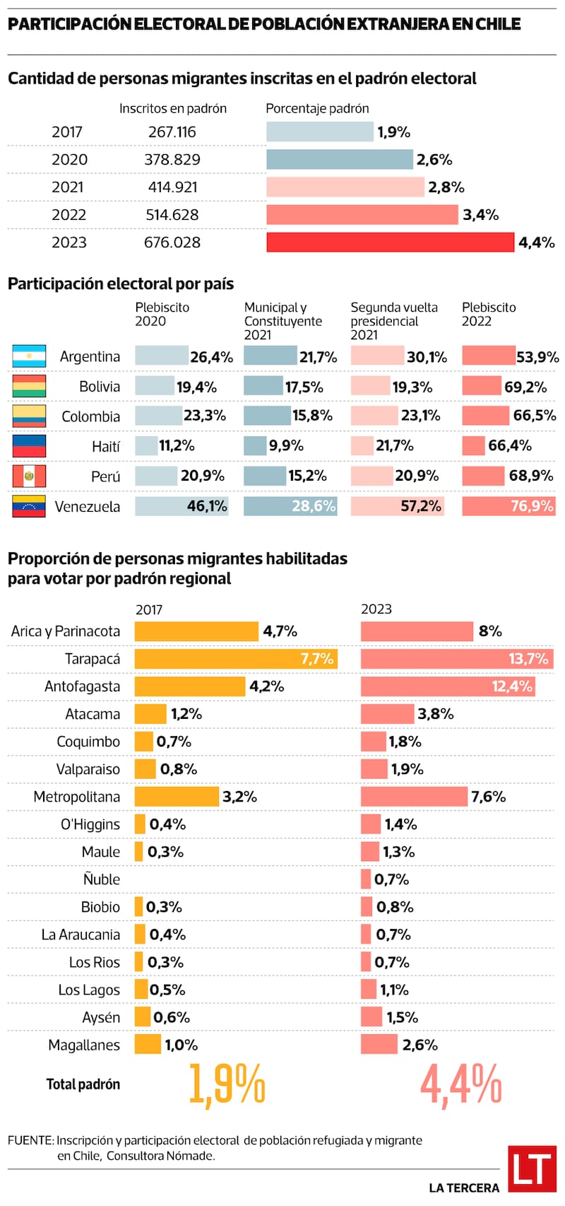 Según datos del Servicio Electoral (Servel), analizados por la consultora Nómade, gracias a la política pública de inclusión electoral ahora el 4,4% del padrón nacional está compuesto por migrantes. Es decir, desde el 4-S hasta el 17-D se registró un aumento de un 31,3%, con 161.400 nuevos votantes extranjeros entre un proceso constitucional y el otro.
